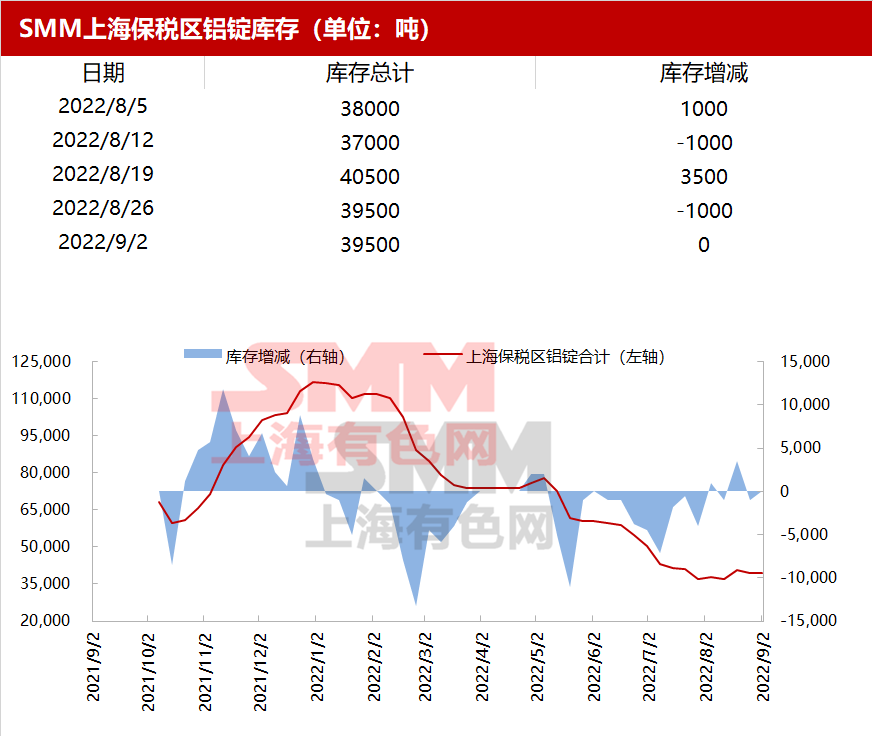 9月2日SMM统计上海保税区电解铝库存为39500吨,环比上周持平。