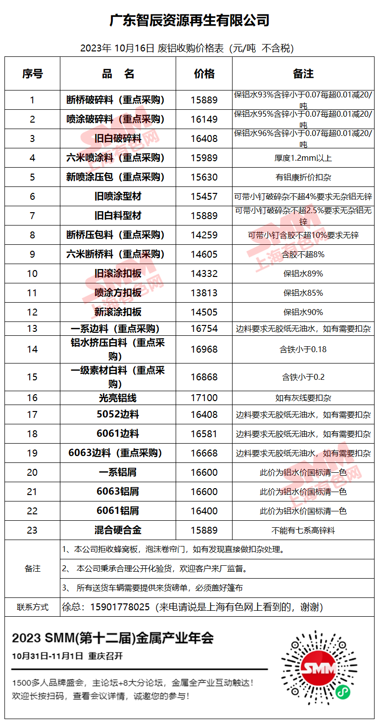 广东智辰资源再生有限公司今日主要废铝料收购价目表,有废铝出货的朋友,请与我们联系。