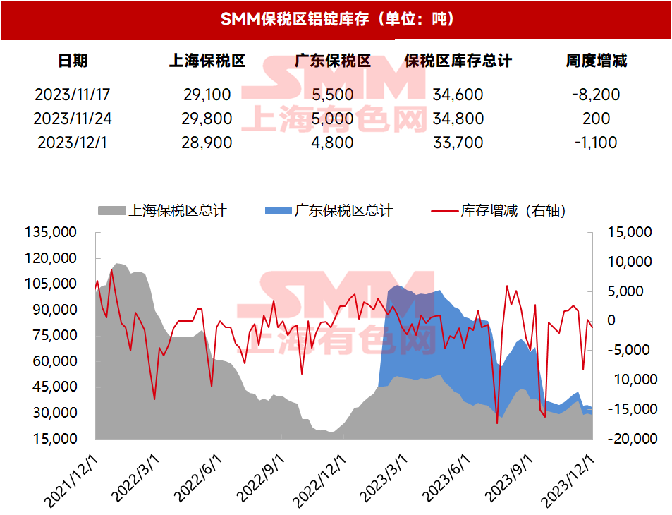 2023年12月1日电解铝保税区库存:库存小幅降低【SMM数据】