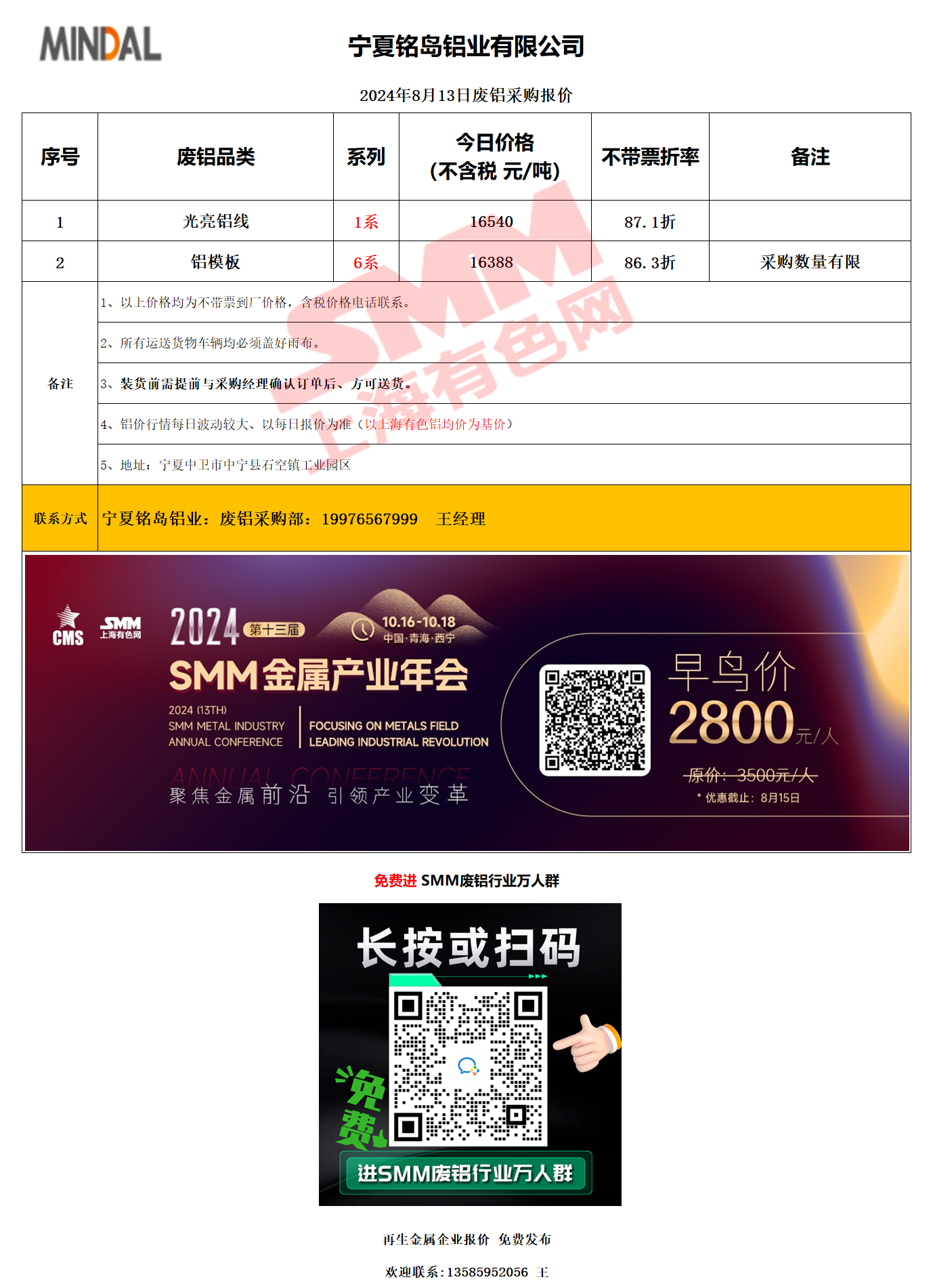 今日宁夏铭岛铝业 废铝采购报价已更新,有货的朋友欢迎联系我们!