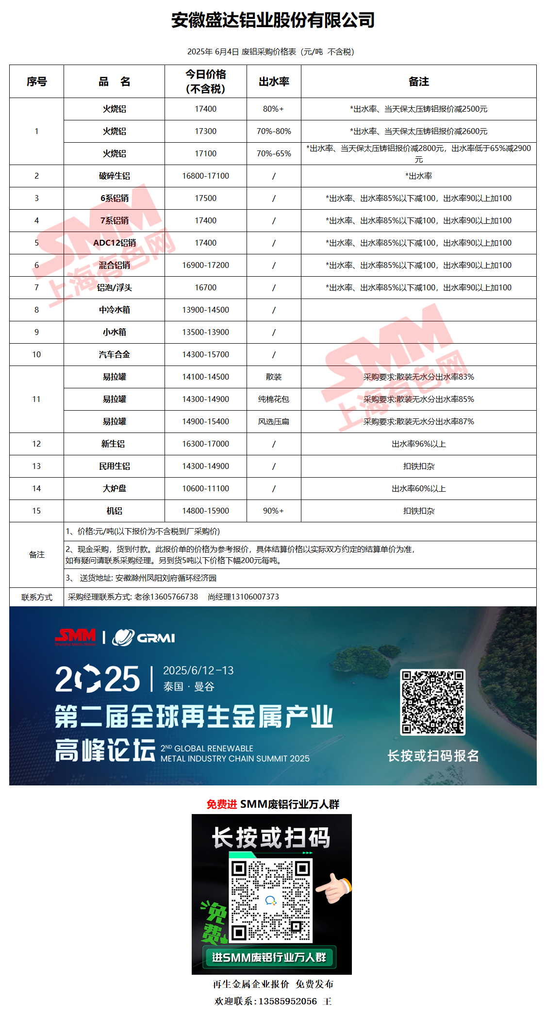 今日安徽盛达 废铝采购报价已更新,有货的朋友欢迎联系我们!