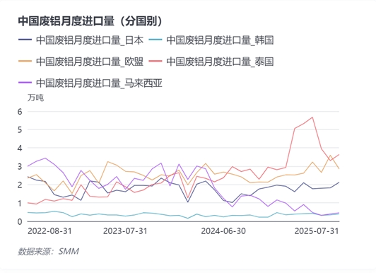 尽管 2025 年 2 月特朗普政府宣布对铝产品加征关税但豁免废铝,在外界普遍预测欧州美州废铝资源会回流美国的情况下,截至 7 月的数据并未显示中国自欧盟进口受到明显冲击,反而呈稳健增长。相较之下,东南亚的泰国与马来西亚受区域政治事件及非法出口团伙干扰,3–4 月后对华出口持续萎缩。