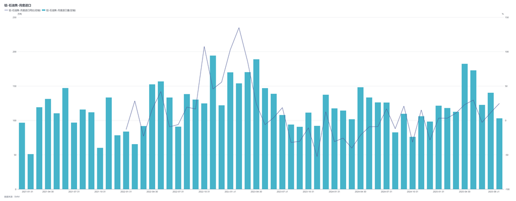 据海关数据显示,2025 年 8 月我国石油焦进口 103.04 万吨,环比减少 26.53%,同比增加 24.74%;粗略估计 8 月石油焦进口价格为 199.06 美元 / 吨,环比减少 1.79%,同比增加 30.45%。2025 年 1-8 月我国石油焦累计进口总量约为 1072.90 万吨,同比增加 12.96%。