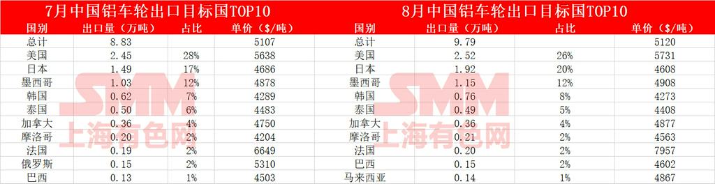 8 月,中国铝合金轮毂出口量大幅增加 0.96 万吨至 9.79 万吨,环比增长 10.9%,同比增长 18.4%,创下近三年单月出口量新高。从出口目标国来看,7 - 8 月美国、日本、墨西哥等传统市场需求稳定,且 8 月对法国等国出口单价显著提升,海外需求增长势头迅猛,极大提振了铝轮毂出口企业的生产信心。