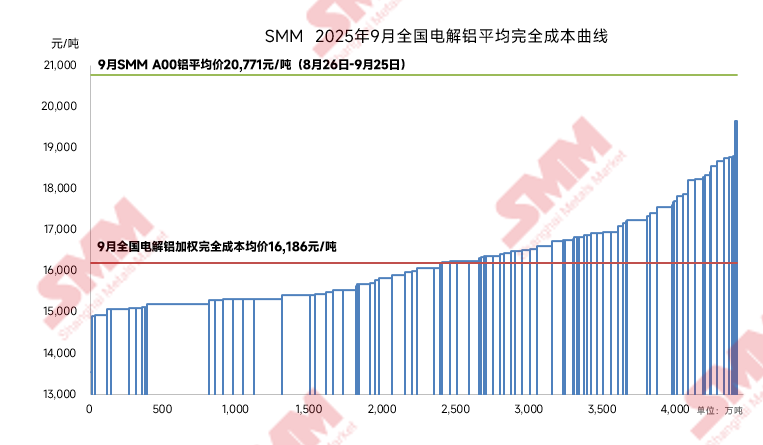 据SMM数据显示,2025年9月份中国电解铝行业含税完全成本平均值为16,186元/吨,环比下跌1.5%,同比下跌6.4%,主因周期内氧化铝月均价下跌,成本下降。据SMM数据显示,9月SMM氧化铝指数月均3113元/吨(8月26日- 9月25日),9月全国电解铝行业的氧化铝加权平均成本环比下降4.3%;SMM A00现货均价约为20,772元/吨(8月26日-9月25日),国内电解铝行业平均盈利约4586元/吨。