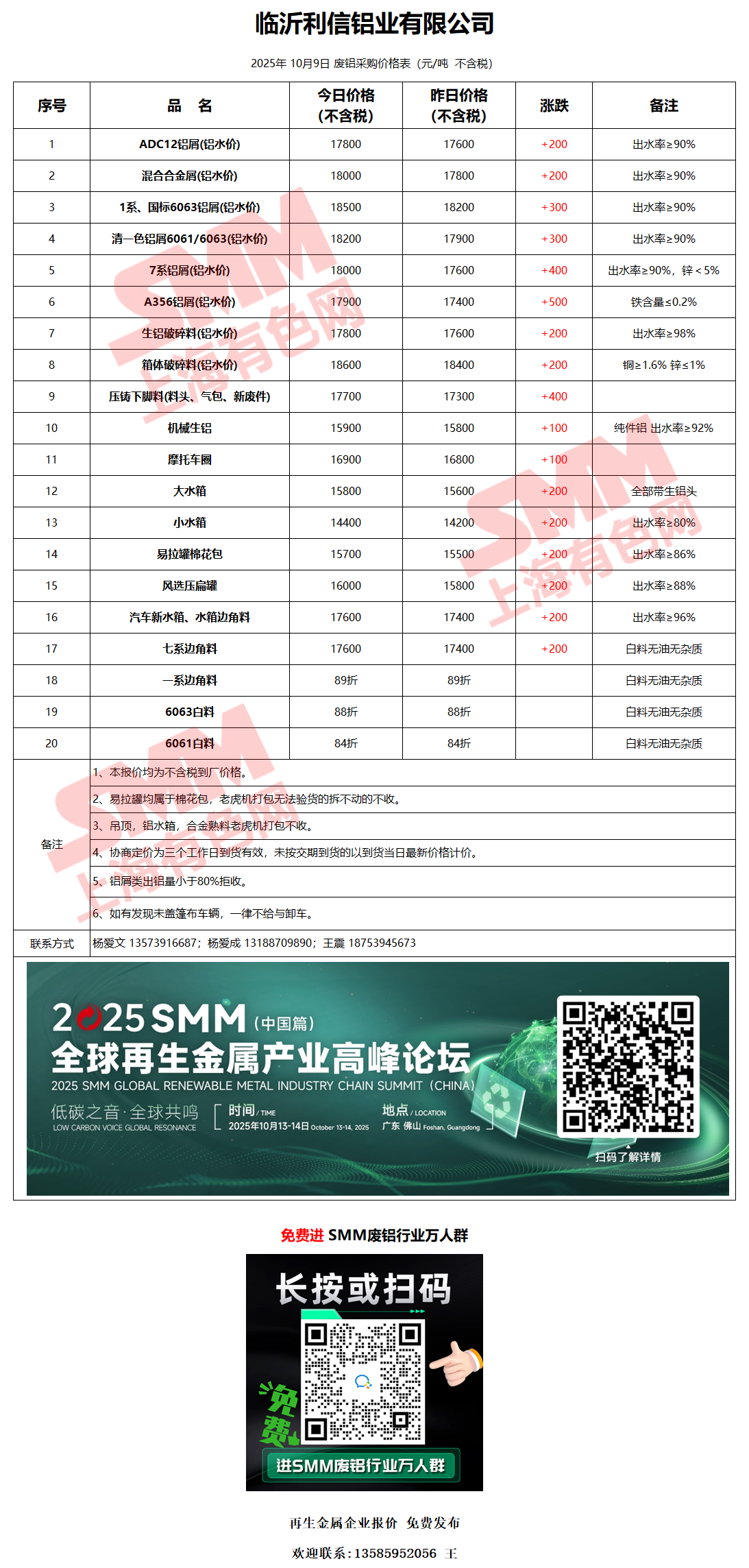 10月9日临沂利信 废铝采购报价