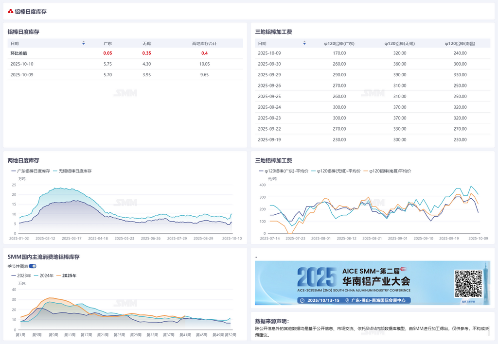 【SMM国内两地铝棒日度库存】 2025年10月10日,据SMM统计,国内铝棒两地库存方面,广东铝棒库存5.75万吨,无锡铝棒库存4.30万吨,合计10.05万吨,较上期库存上涨0.4万吨