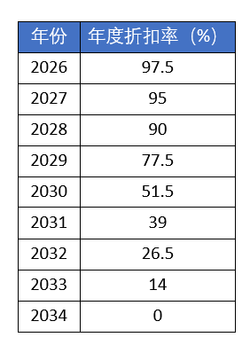 年度折扣率 :2026–2034年逐年下调,2034年归零