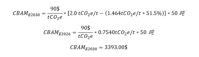 进口50吨未锻轧铝(HS7601),假设碳强度2.0 tCO2e/t, EUA价90 €/tCO2e,CBAM基准1.464 tCO2e/t: