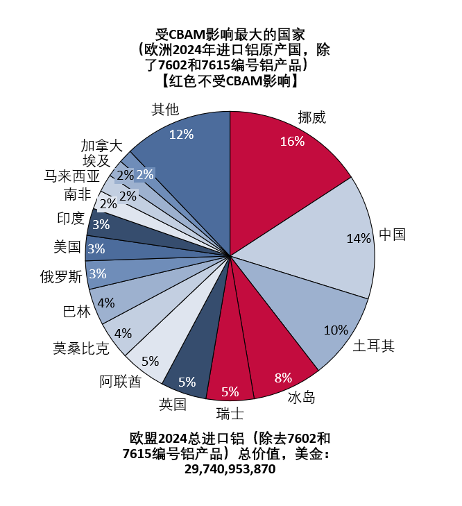 - 挪威、冰岛、瑞士占欧盟铝进口价值29%,但不受CBAM约束;