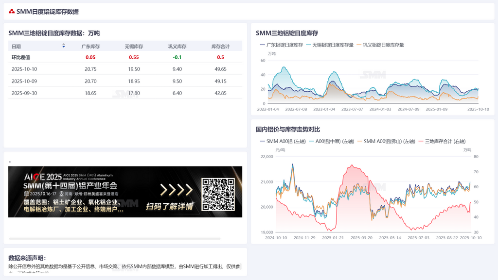 2025年10月10日 SMM三地铝锭日度库存数据快讯【SMM数据】