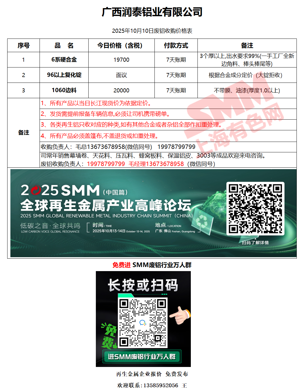 今日广西润泰铝业 废铝采购报价已更新,有货的朋友欢迎联系我们!
