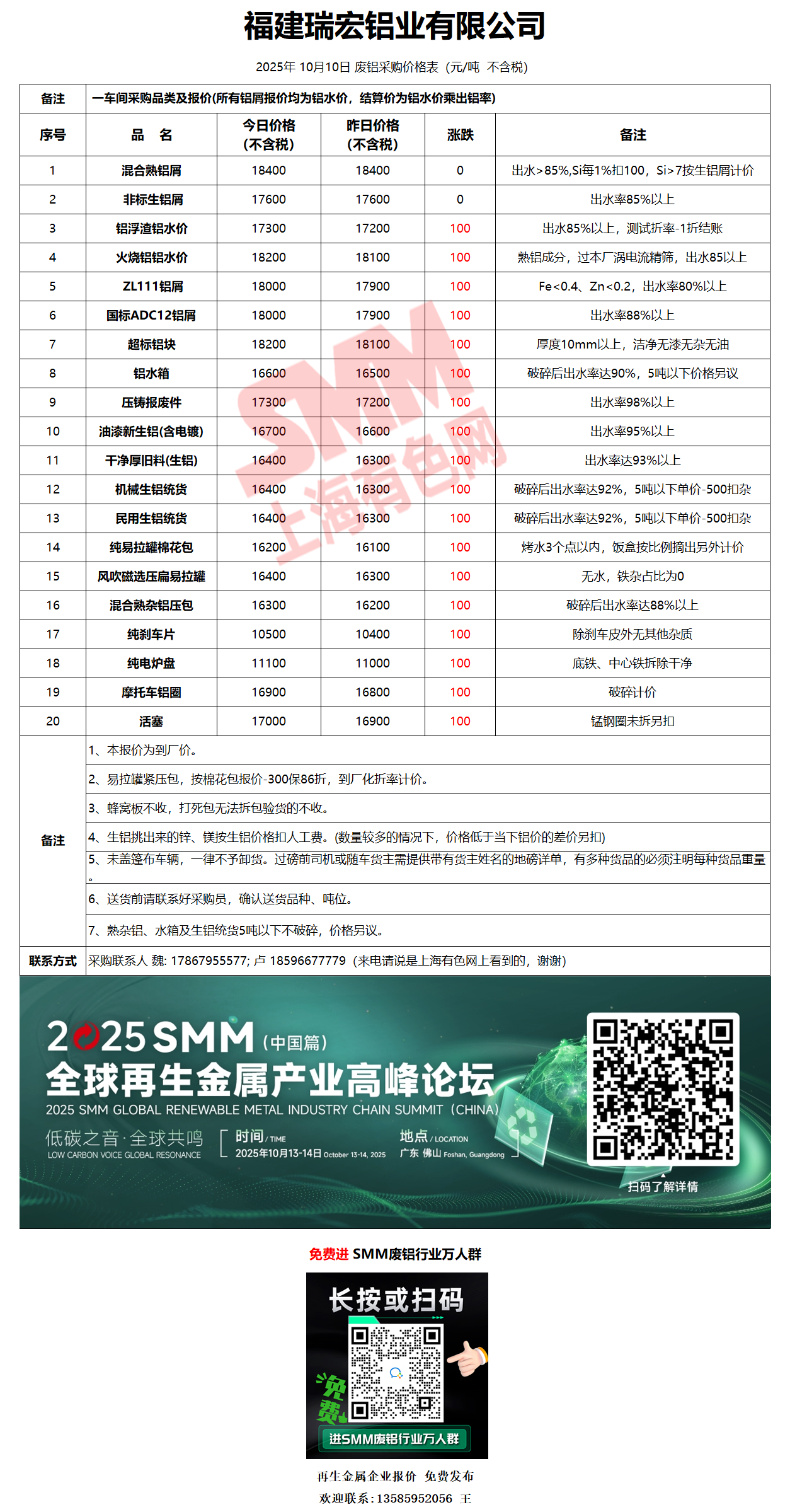 今日福建瑞宏 废铝采购报价已更新,有货的朋友欢迎联系我们!