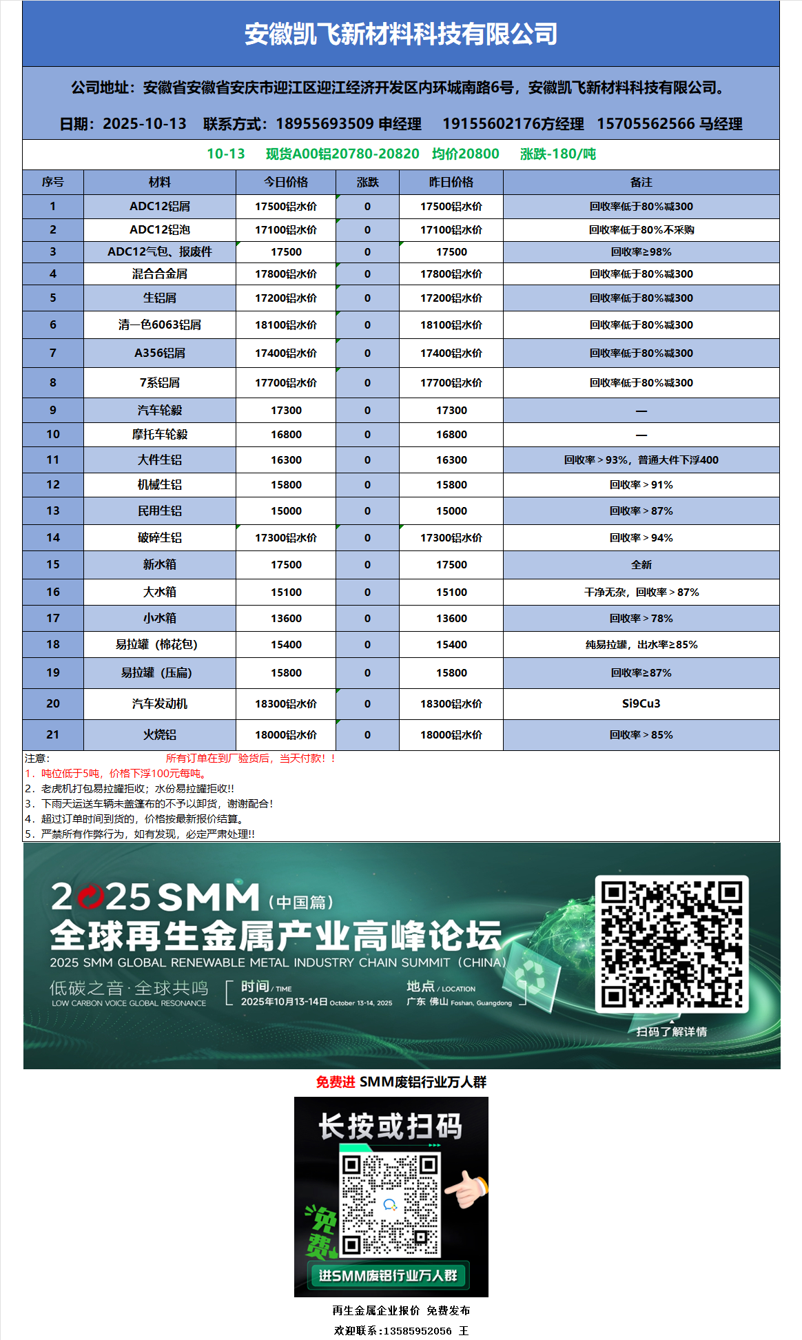 今日安徽凯飞 废铝采购报价已更新,有货的朋友欢迎联系我们!