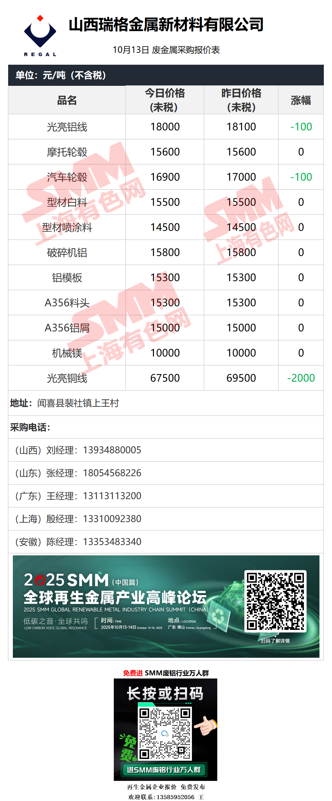 今日瑞格金属 废铝采购报价已更新,有货的朋友欢迎联系我们!