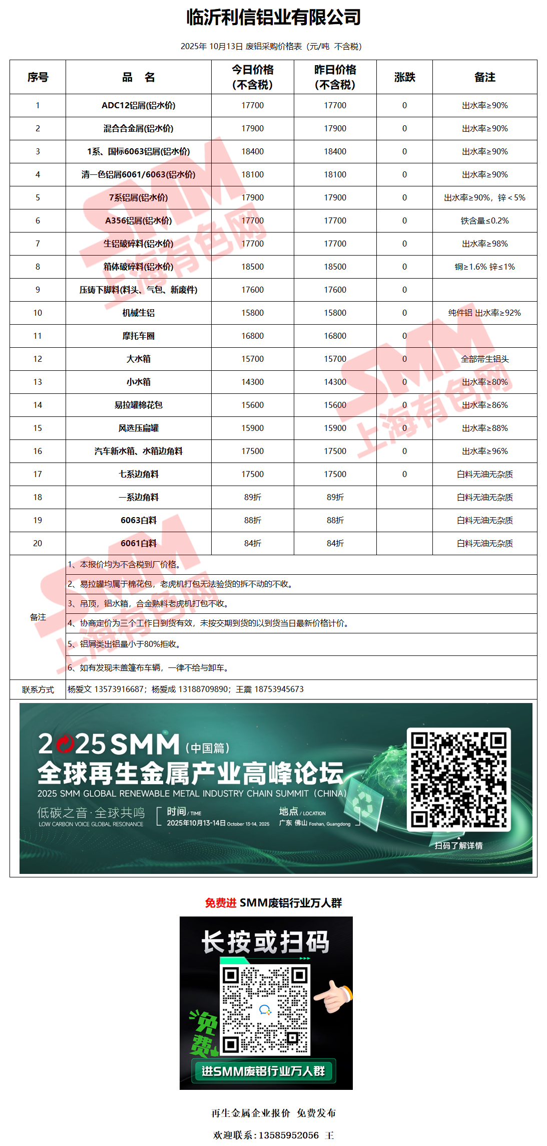 今日临沂利信 废铝采购报价已更新,有货的朋友欢迎联系我们!