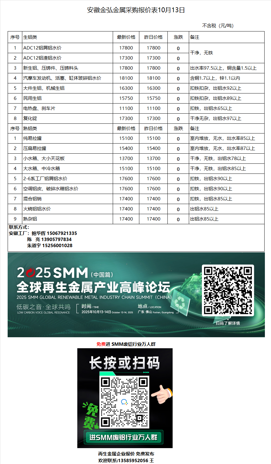 今日安徽金弘 废铝采购报价已更新,有货的朋友欢迎联系我们!