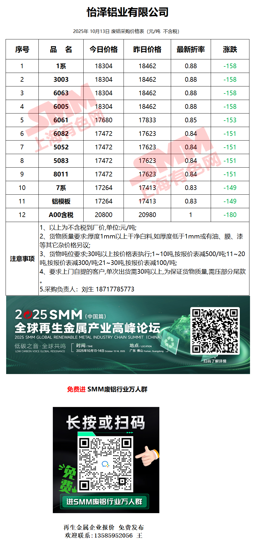 今日怡泽铝业 废铝采购报价已更新,有货的朋友欢迎联系我们!