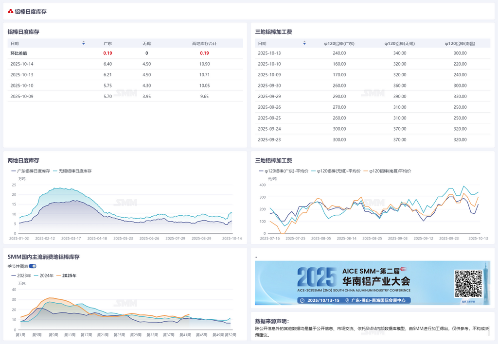 【SMM国内两地铝棒日度库存】 2025年10月14日,据SMM统计,国内铝棒两地库存方面,广东铝棒库存6.40万吨,无锡铝棒库存4.50万吨,合计10.90万吨,较上期库存上涨0.19万吨