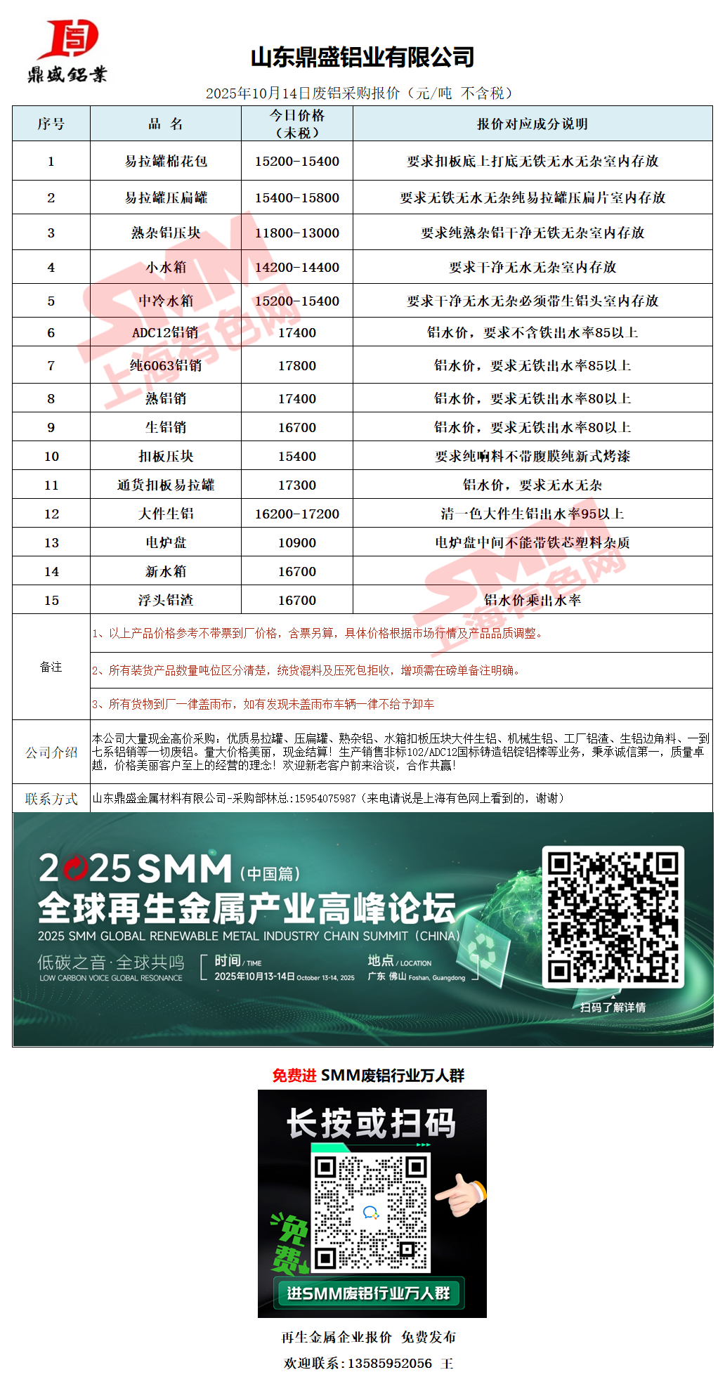 今日山东鼎盛 废铝采购报价已更新,有货的朋友欢迎联系我们!