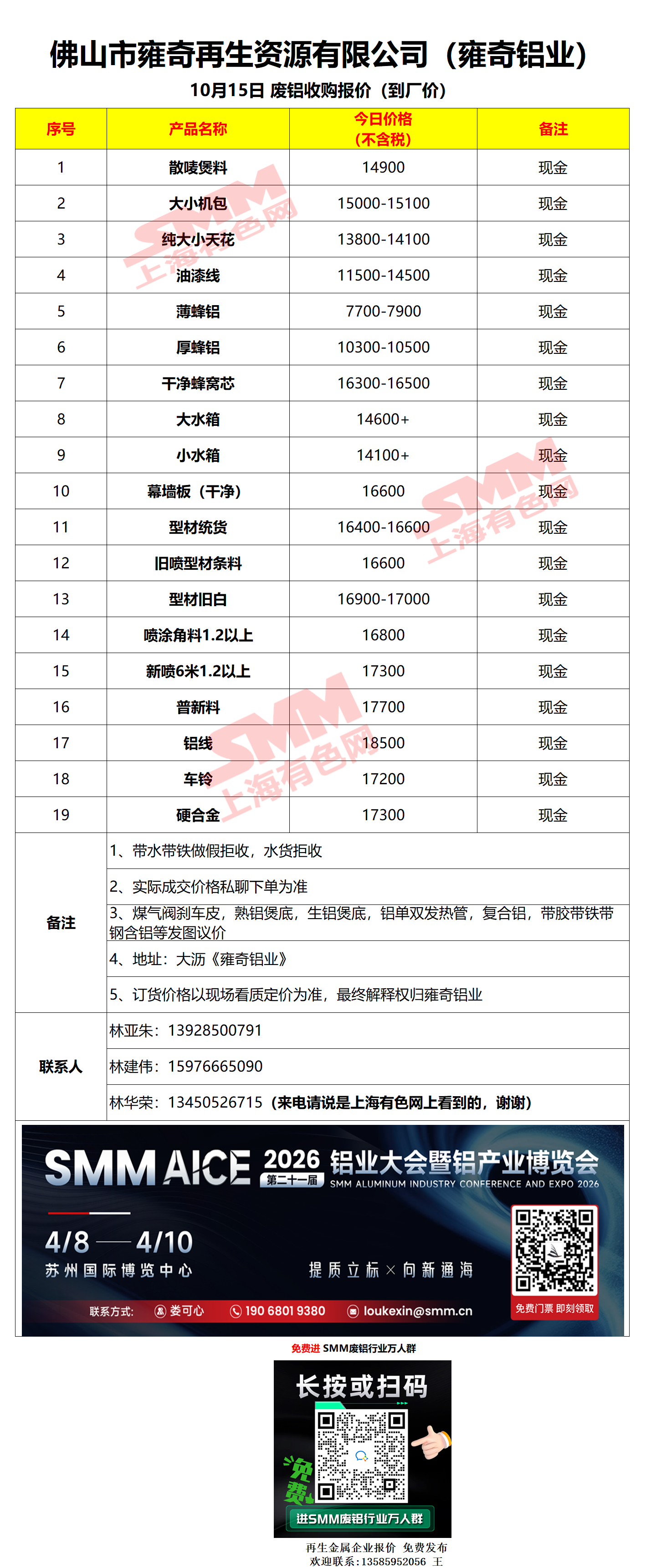 10月15日佛山雍奇 废铝采购报价