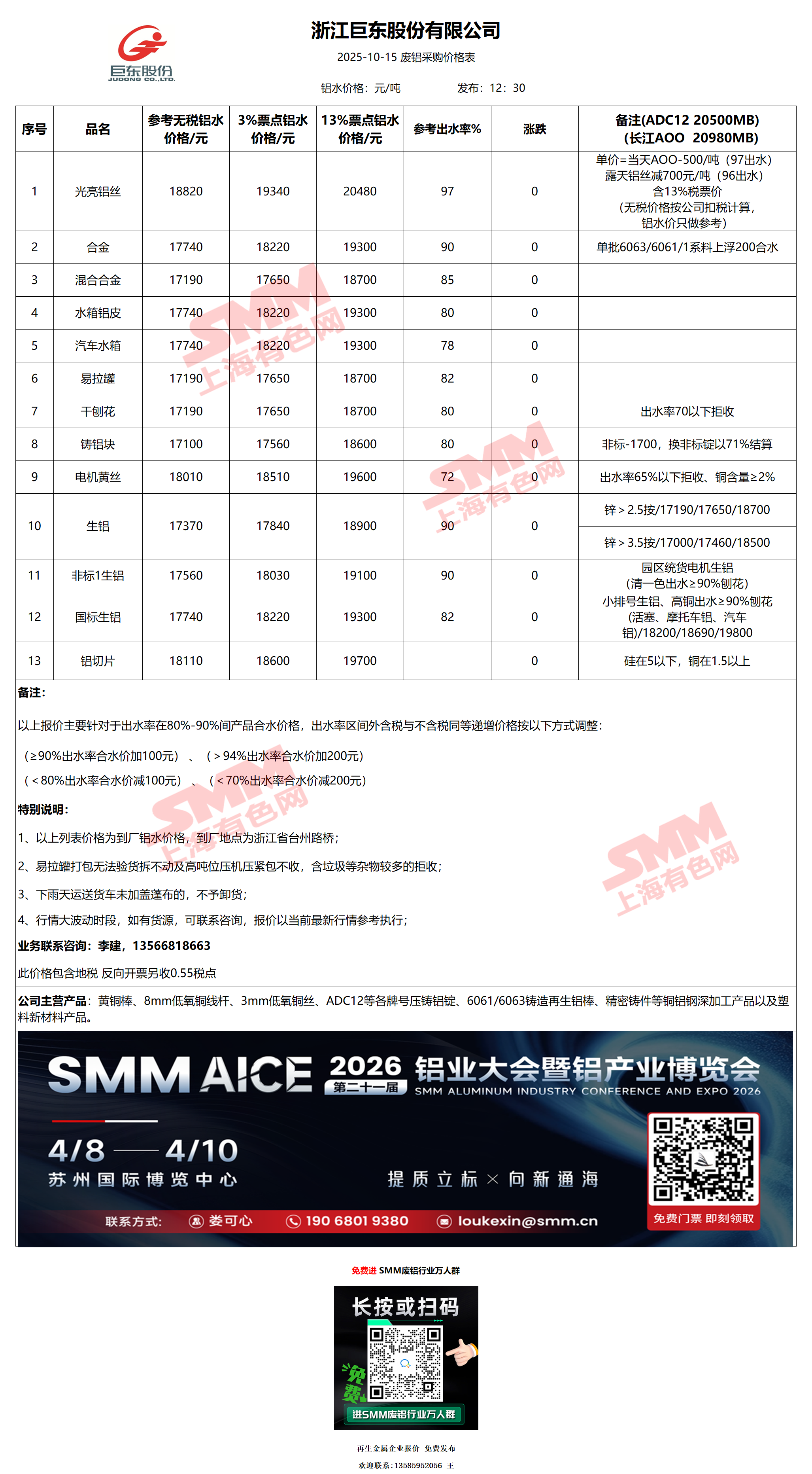 今日浙江巨东 废铝采购报价已更新,有货的朋友欢迎联系我们!