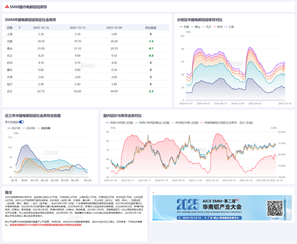 据SMM统计,10月16日国内主流消费地电解铝锭库存62.70万吨,较周一下降2.3万吨,较上周四下降2.2万吨。(库存数据已于 9:00 在数据终端完成更新)
