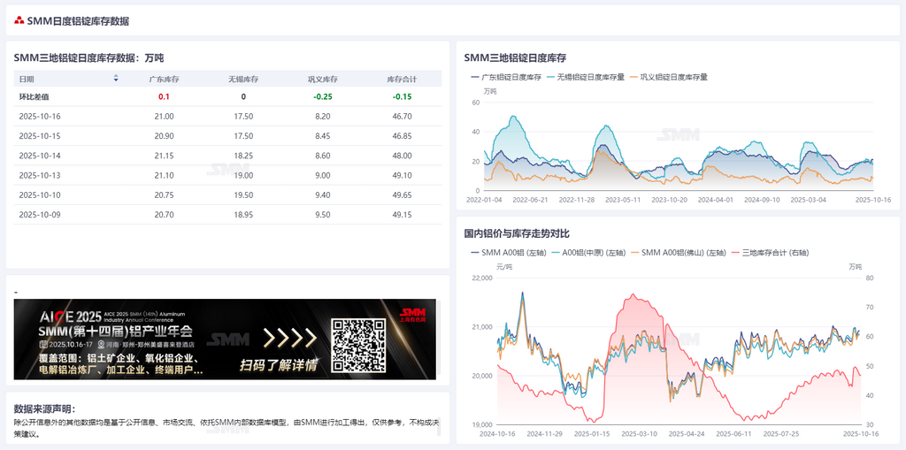 2025年10月16日 SMM三地铝锭日度库存数据快讯【SMM数据】