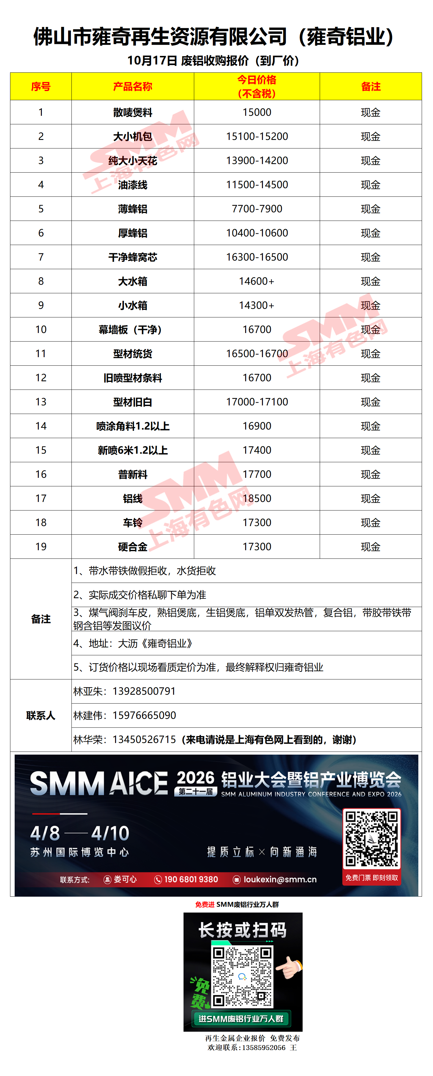 今日佛山雍奇 废铝采购报价已更新,有货的朋友欢迎联系我们!