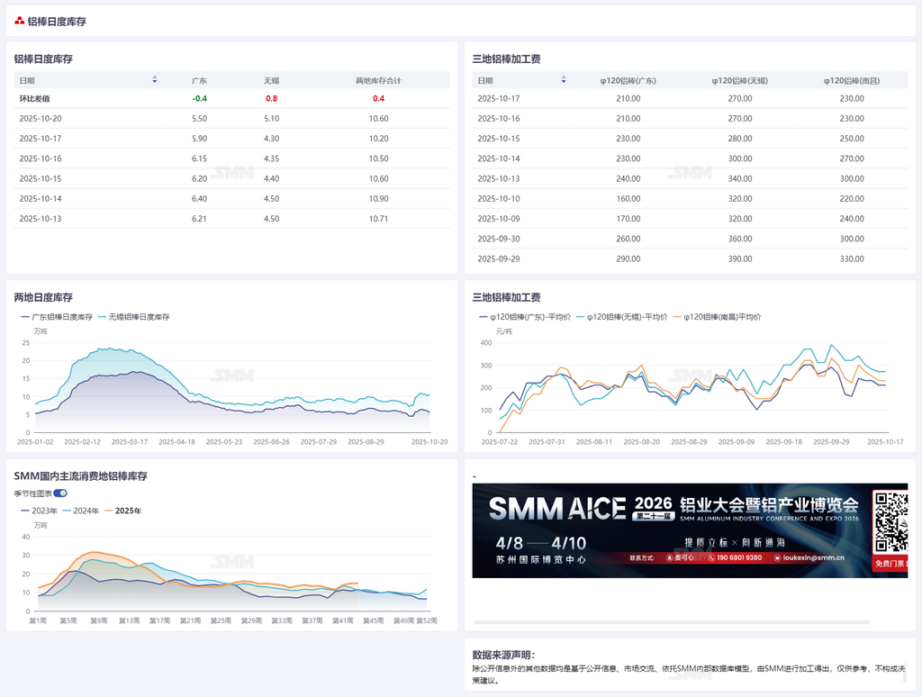 2025年10月20日铝棒库存数据快讯【SMM数据】