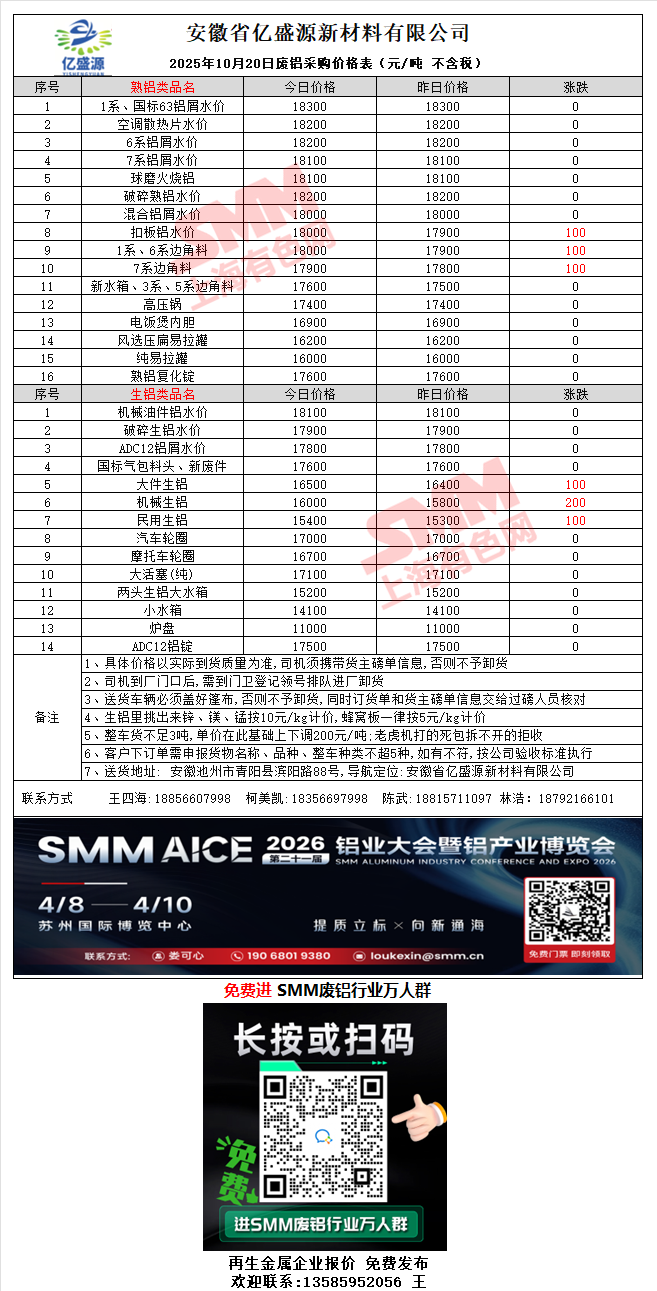 10月20日安徽亿盛源 废铝采购报价