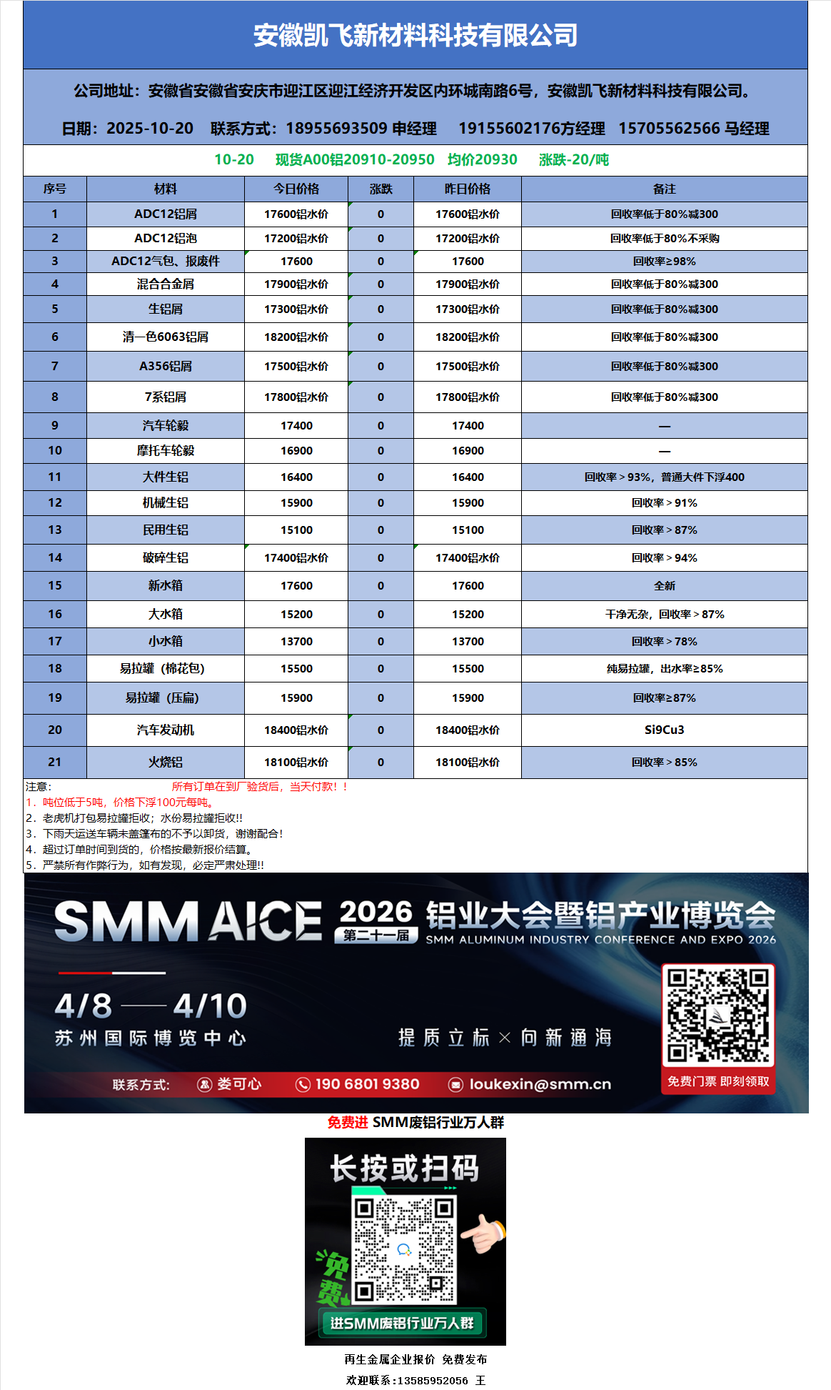 今日安徽凯飞 废铝采购报价已更新,有货的朋友欢迎联系我们!