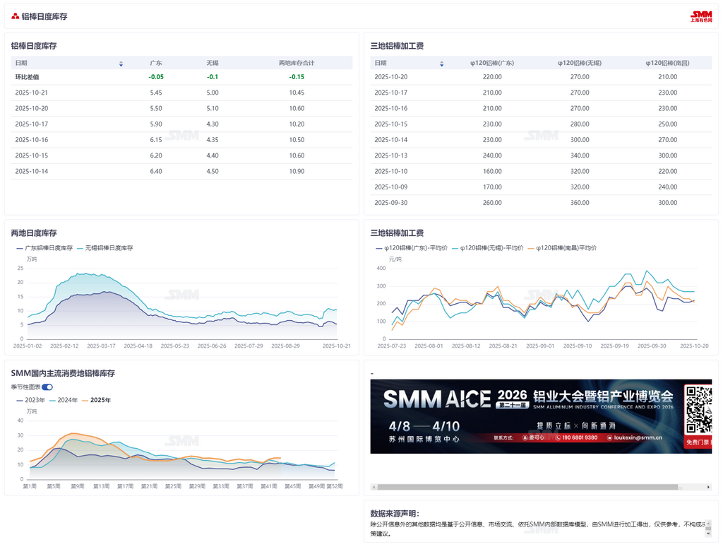 2025年10月21日铝棒库存数据快讯【SMM数据】