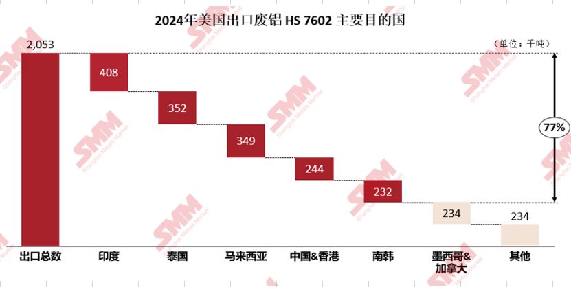 根据美国铝业协会的数据,2024年美国产生了760万吨废铝,其中76%(560万吨)在本地消费,24%(200万吨)用于出口。具体而言,美国废铝出口主要流向亚洲市场,印度、泰国、马来西亚、韩国和我国(含香港)是2024年美国废铝(海关编码7602)的前五大进口方,占美国废铝出口总量的77%。另一方面,2024年美国进口了约68万吨废铝,其中加拿大和墨西哥占进口总量的90%。