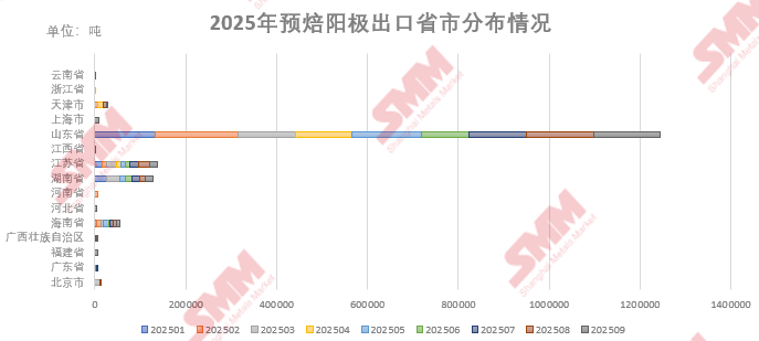 从国内出口地区来看,2025年预焙阳极出口集中在山东、江苏及湖南地区,其中山东地区累计出口总量为124.40万吨,占总量的76%,居于首位;其次为江苏地区累计出口总量为13.81万吨,占总量的9%,然后为湖南地区累计出口总量为12.74万吨,占总量的8%。