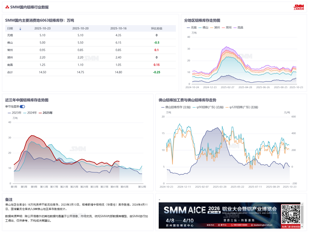 【SMM国内铝棒周度库存统计】 据SMM统计,10月23日国内主流消费地铝棒库存14.50万吨,较周一库存下跌0.25万吨,较上周四库存下跌0.3万吨。