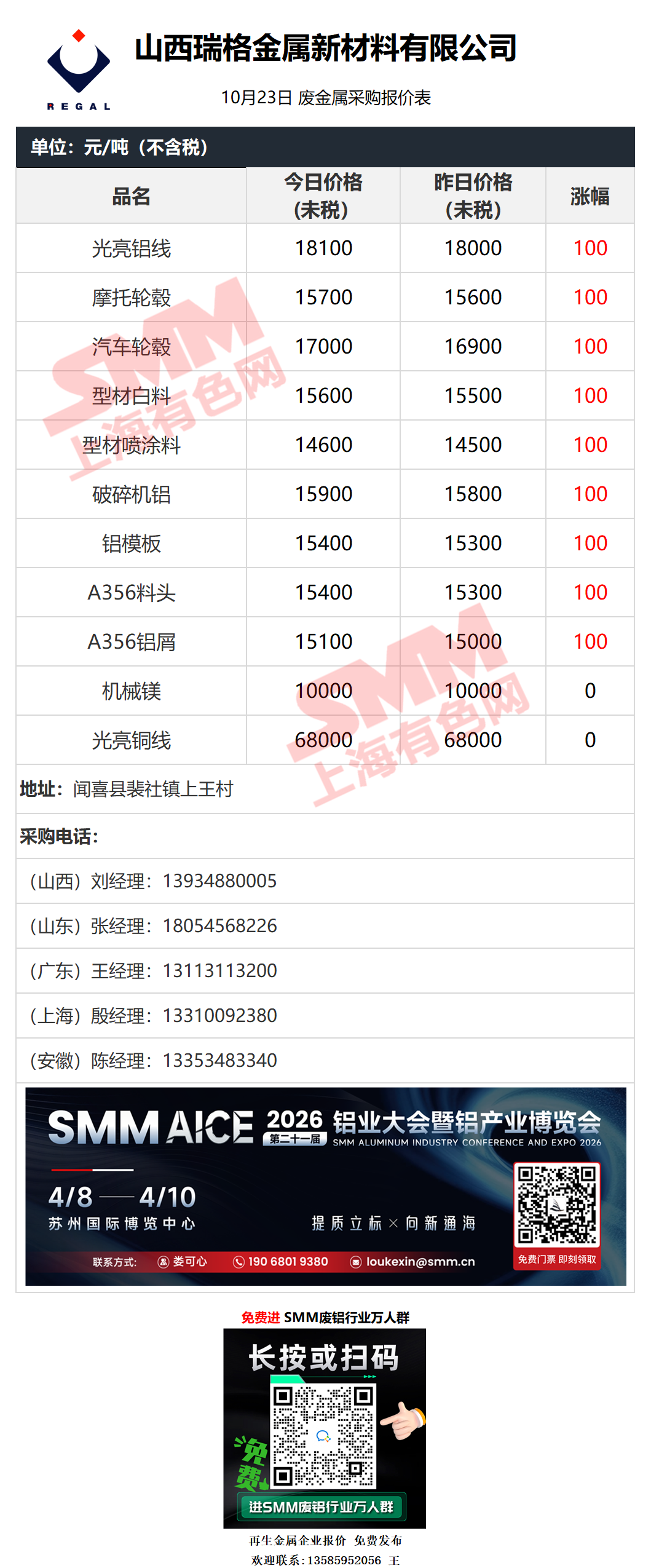 今日瑞格金属 废铝采购报价已更新,有货的朋友欢迎联系我们!