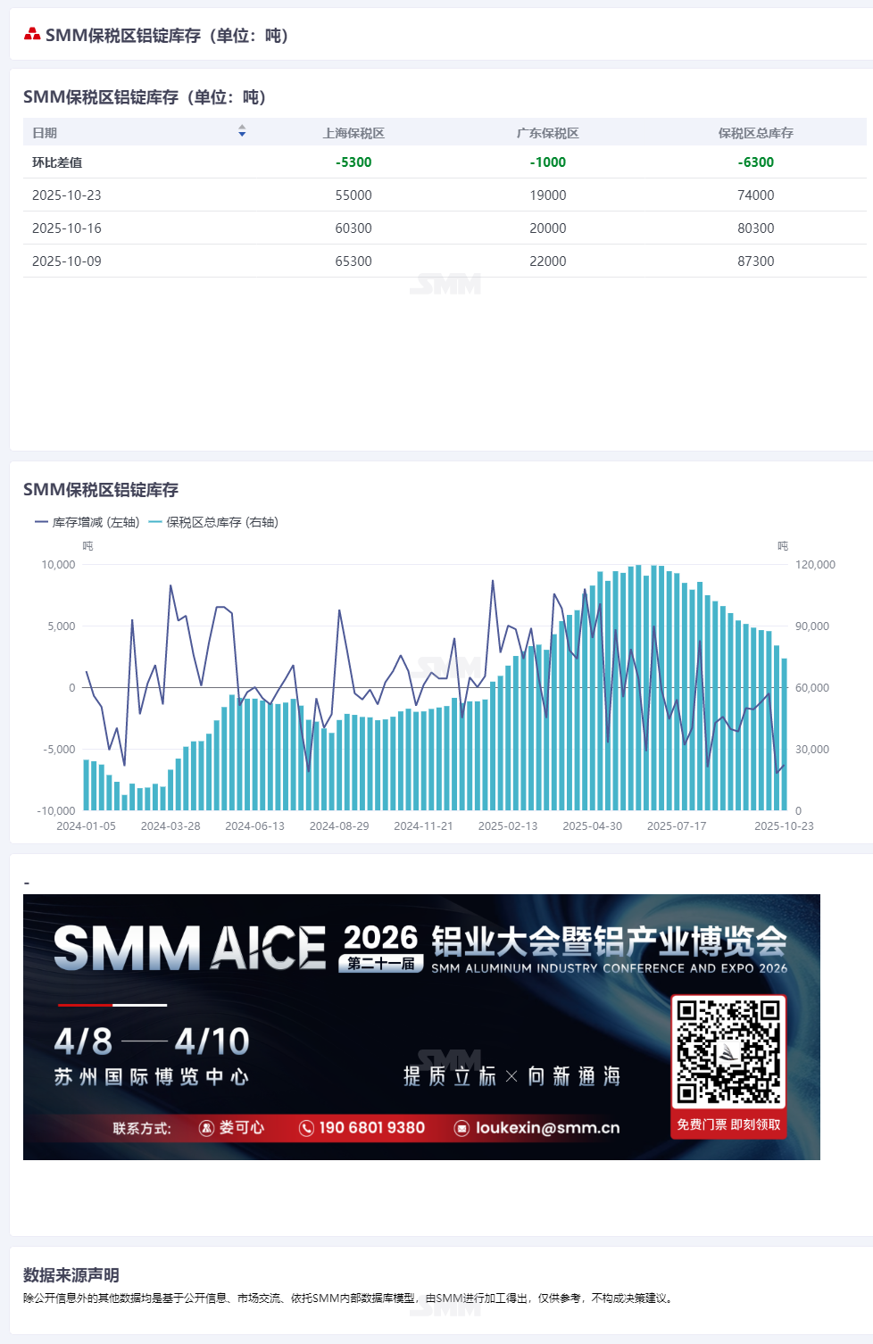 【SMM国内保税区电解铝库存统计】 10月23日,SMM统计上海保税区电解铝库存为55000吨,广东保税区库存19000吨,总计库存74000吨,库存较上周减少6300吨。