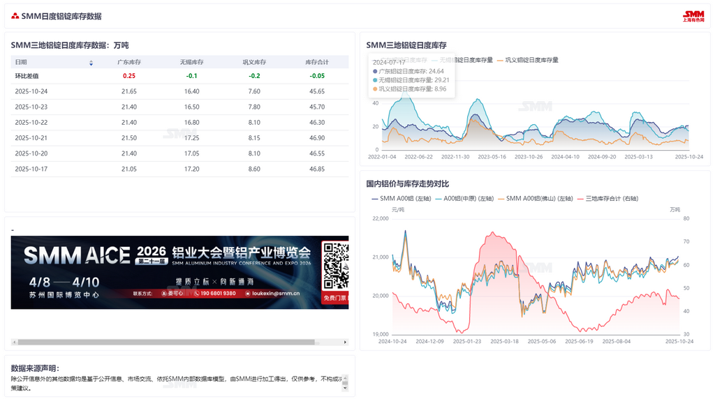 2025年10月24日 SMM三地铝锭日度库存数据快讯【SMM数据】