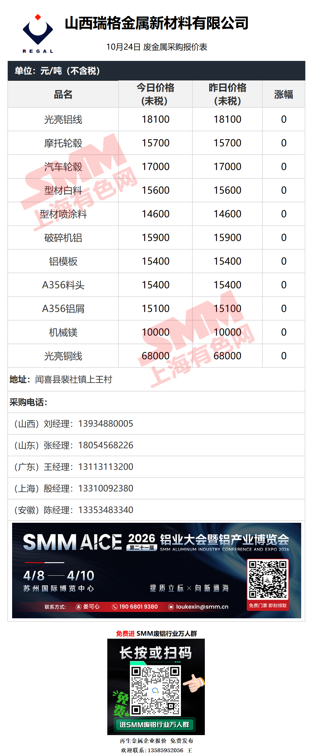 10月24日瑞格金属 废铝采购报价