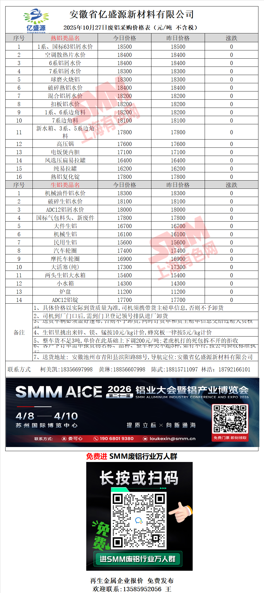 今日安徽亿盛源 废铝采购报价已更新,有货的朋友欢迎联系我们!