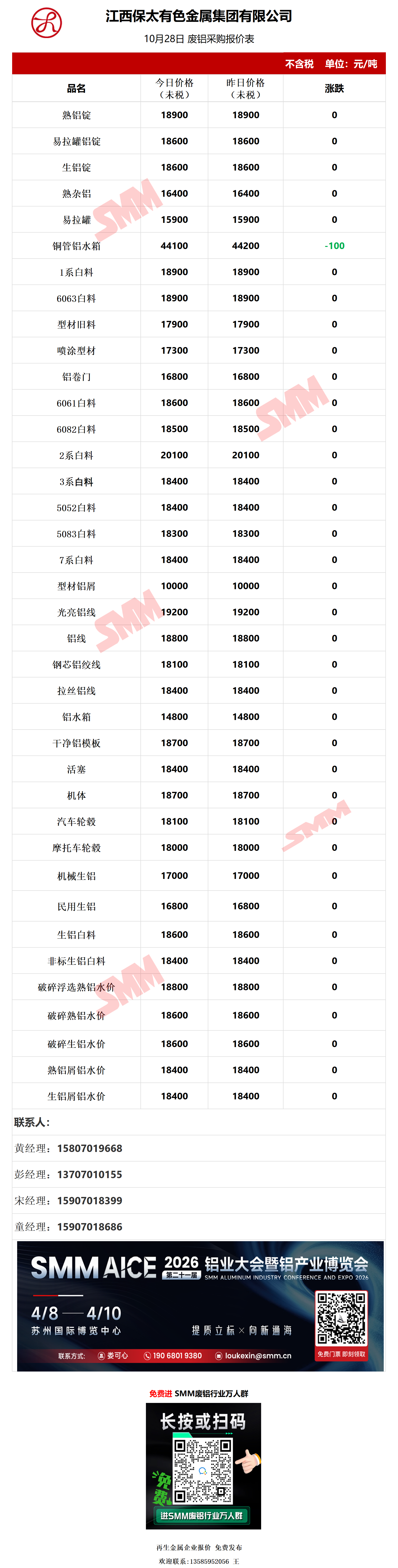 10月28日江西保太 废铝采购报价