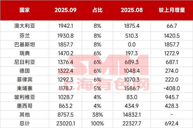 9 月我国铝线缆出口市场中,澳大利亚以 1942.1 吨出口量、占比 8% 位居榜首,较上月增加 66.7 吨;芬兰以 1930.8 吨出口量、占比 8% 位列第二,较上月实现 1420.5 吨的显著增长;巴基斯坦以 1857.7 吨出口量、占比 8% 位列第三,较上月增加 1857.7 吨。当前多国市场需求释放明显,芬兰、瑞典、巴基斯坦等国受基建拓展、工业发展等因素推动,对铝线缆需求提升,成为我国9月份铝线缆出口增长的关键驱动力。