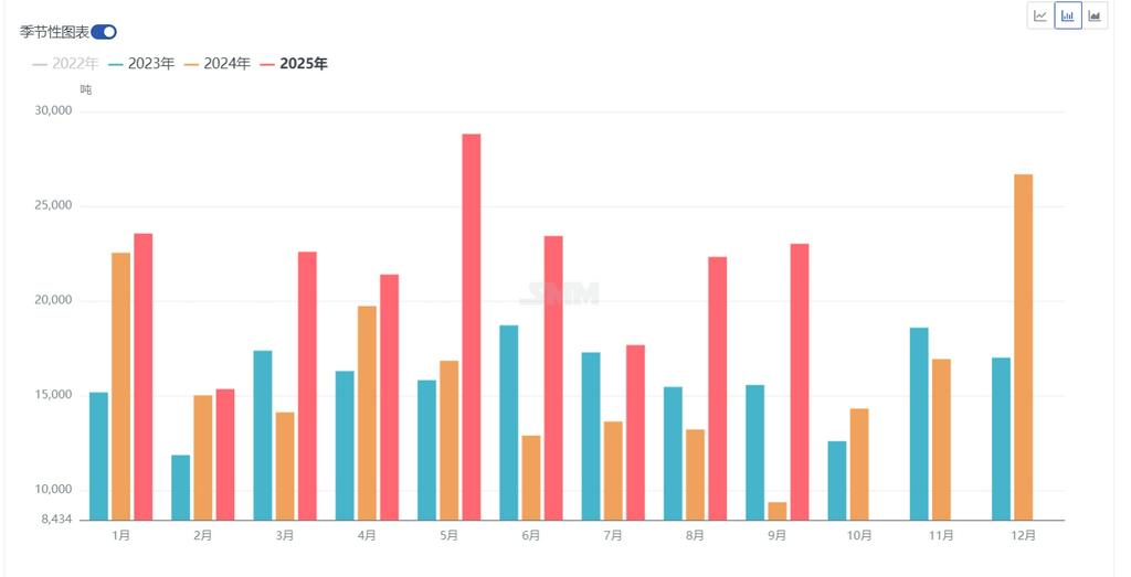 海关数据显示,2025年9月中国铝线缆出口量达2.3万吨,环比增长3.1%,同比增长145%;1-9月累计出口19.8万吨,较2024年同期15.16万吨同比增幅30.6%。从不同产品来看,钢芯铝绞股线出口1.55万吨,环比增长4%,同比增长233%,出口量占比67%;铝制绞股线出口0.75万吨,环比增长2%,同比增长59%,出口量占比33%。(海关编码:76141000、76149000)