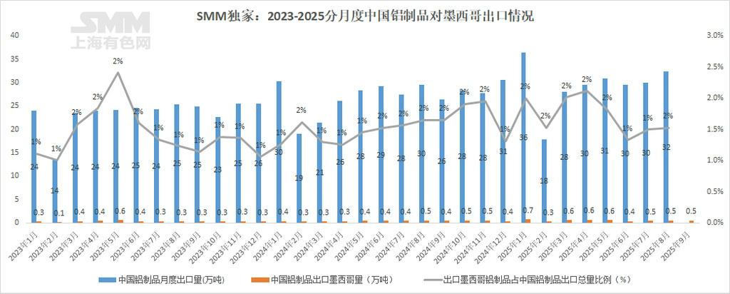 【SMM分析:墨西哥关税壁垒升级 中国铝材及铝制品对墨出口韧性与挑战并存】作为全球铝产业链重要参与者,中国铝材及铝制品对墨西哥出口在近年来的贸易摩擦中呈现出复杂的 “韧性与挑战” 并存格局。近年来,中墨贸易关系因墨西哥多次单方面加征关税及限制措施而陷入紧张,呈现 “墨西哥主动施压、中国精准反制” 的博弈格局。结合 SMM 独家监测的 2023-2025 年月度出口数据及墨西哥最新关税政策动态,我们从政策冲击、数据趋势、原因和影响、行业应对四个维度展开深度分析。