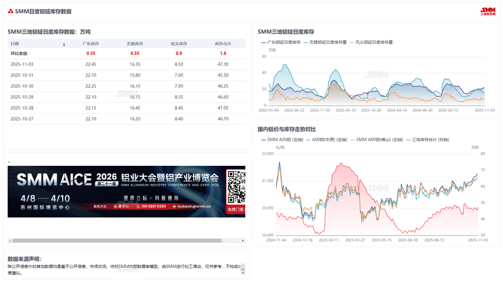 2025年11月3日 SMM三地铝锭日度库存数据快讯【SMM数据】