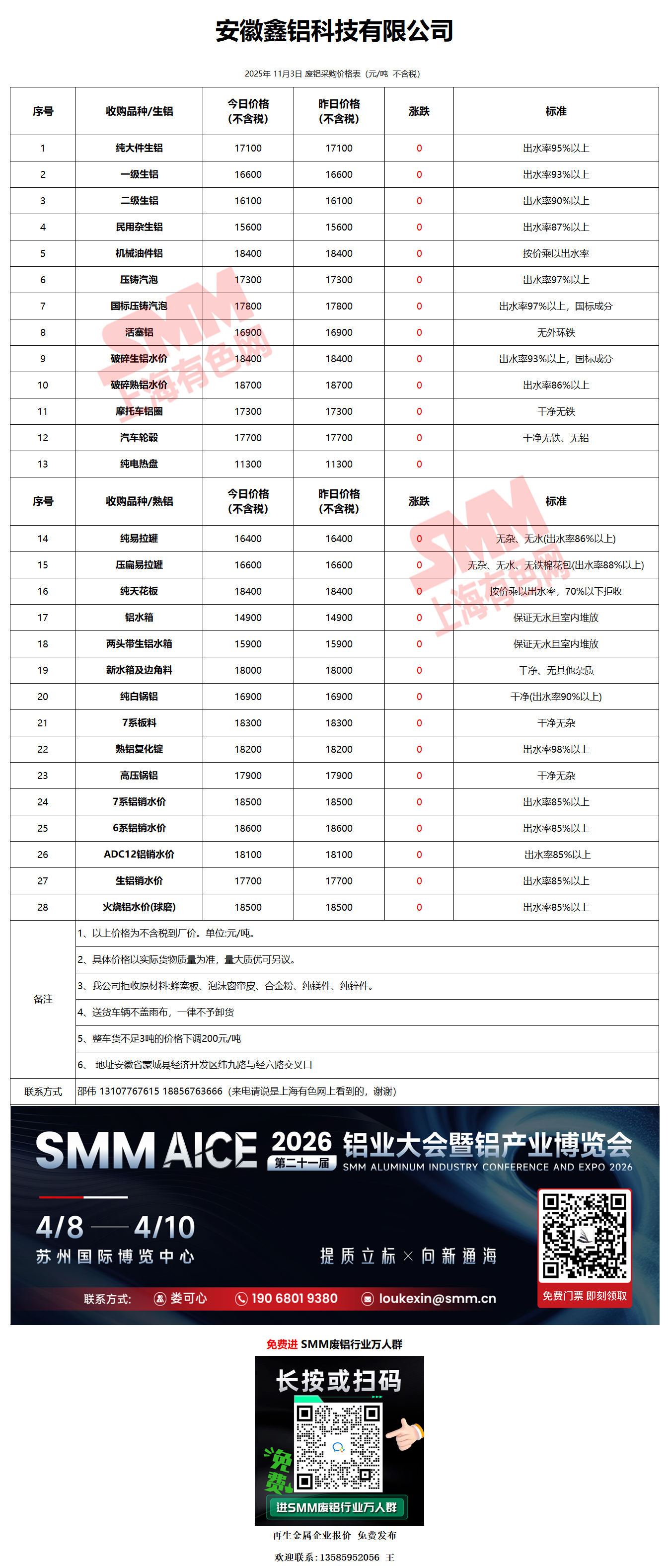 今日安徽鑫铝 废铝采购报价已更新,有货的朋友欢迎联系我们!