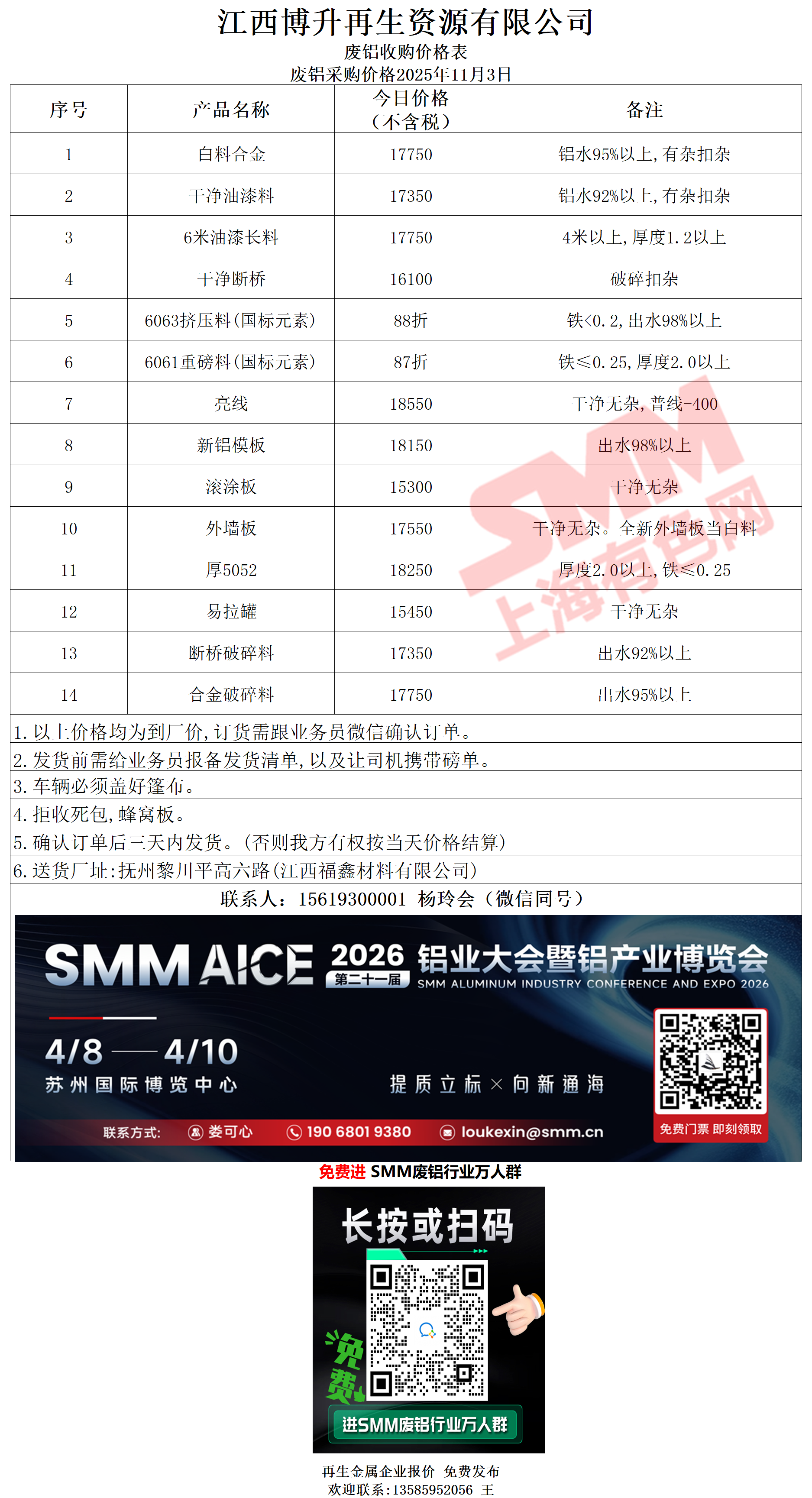 今日江西博升 废铝采购报价已更新,有货的朋友欢迎联系我们!