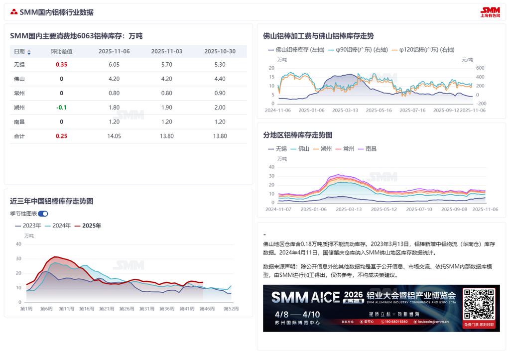 据SMM统计,11月6日国内主流消费地铝棒库存14.05万吨,较周一库存上涨0.25万吨,较上周四库存上涨0.25万吨。