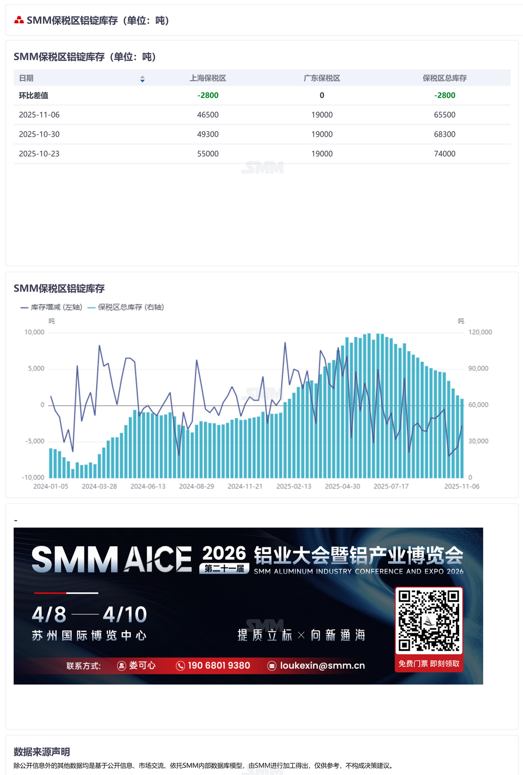 【SMM国内保税区电解铝库存统计】 11月6日,SMM统计上海保税区电解铝库存为46500吨,广东保税区库存19000吨,总计库存65500吨,库存较上周减少2800吨。